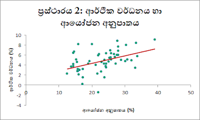 පහත දෙවන ප්රස්ථාරයෙන් පෙනෙන පරිදි යම් වසරක් තුළ ලංකාවේ ආයෝජන අනුපාතය 10%කින් වැඩිවන විට ආර්ථික වර්ධනය 1.5%කින් පමණ වැඩි වී තිබේ. ණය වෙනුවෙන් ගෙවන පොලිය ආදායම් වර්ධනයට වඩා අඩුනම් වැඩේ නරක නැත. එසේනම්, කළ යුත්තේ ණය වී හෝ ආයෝජනය කිරීමද? ලංකාවේ ආණ්ඩු ලෝකයට ණය නොවේනම් රටට ගොඩ යාමට වෙන විදිහක් නැද්ද?